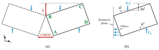 The crack opening condition is imposed on the edge AB (Figure 4). Edge CD is free to move in the XY plane. No bridging law is applied to the upper crack path point (see point B in Figure 4b). The modeled bridging law transfers tensile load in a single, x-axis direction. Thus, once the crack path is opened at the particular point (node), only normal traction (positive normal direction) forces can be transferred over the crack faces. One can consider the integral force balance for the whole region (½ of the specimen). Since no other loads act at the x-direction and only traction in the x-direction is allowed along the bridged crack part, some material volume must be under compression (σxx < 0) on the crack path near the opposite edge (see Figure 4). While the crack grows, the compressive region’s length shrinks, and the compressible stress component’s absolute value increases. It is known [] that the material may fail under compression at certain bridged crack sizes in polymeric composites. Still, preliminary analysis shows that this does not happen in the concrete of the type analyzed here due to large differences in tensile and compressive strength. In the model, the need for the force balance mentioned above is considered by fixing a single node (point B) with no crack opening at the final stages when the rest of the crack path is already abridged.