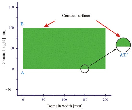 To evaluate the influence of the size of the cell elements on the obtained result, three types of meshes were examined for the concrete sample from Batch C. The calculated maximum force values depending on the maximum size of mesh elements are summarized in Table 3. Considering the obtained results and the time required for computing, a mesh with 2456 elements was chosen as the optimal case for further calculations. An example of a computational domain mesh can be seen in Figure 6. In addition, the refinement of mesh elements was applied to the crack path AB (see Figure 5) and the contact surfaces of the rollers with the sample (see A’D’ in Figure 6). First-order triangular finite elements are used for simulations. Linear triangular elements have been widely used in engineering problems because of their adaptability to complex models, simple calculations, and acceptable accuracy [].