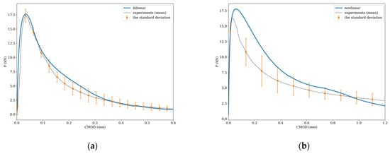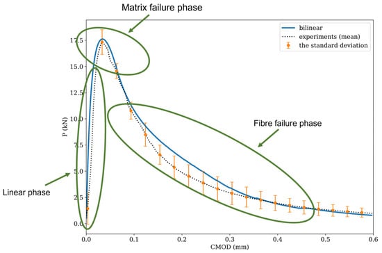 The average peak load from the three experiments for the case without BFs (see Figure 9a) is 17.4 kN, achieved when the CMOD is 0.033 mm. The FE model with the bilinear bridging law function predicts the maximum load at 17.62 kN. The peak is reached when CMOD is 0.034 mm. When using a nonlinear bridging law function, the maximum load is 17.9 kN, which is reached at 0.036 mm. Comparing the values of the fracture work (from the P-CMOD curves), it can be found that in the case of the bilinear function (W = 2.74 Nm), it is closer to the experimental value (W = 2.30 Nm) than the result of the nonlinear function (W = 3.39 Nm).