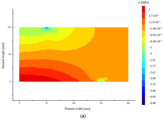 An example of the stress distribution in the Batch C sample obtained by the FE model is shown in Figure 8. Figure 8a shows that the solution in the linear phase corresponds to the Euler–Bernoulli beam theory. The upper left corner of the sample shows compression, while the lower left corner shows tension. Places of loading and supporting rollers are also well visible. While in the matrix failure phase, when the crack starts to open, the stress field has changed significantly, see Figure 8b. The tension-dominated area of the crack path has increased considerably.