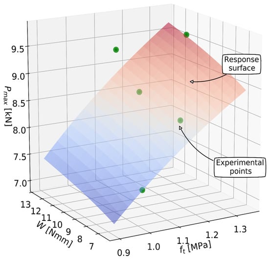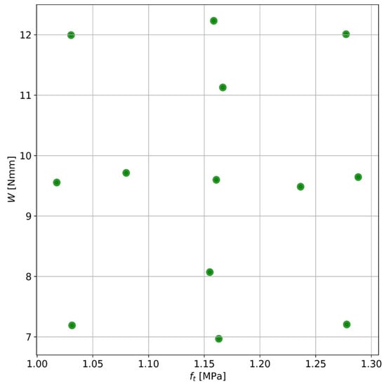 To validate the suitability of the FE modeling approach discussed above for studying the mechanical properties of fiber concrete, modeling was carried out for 3PBT and 4PBT using the same sample batches as in the experiments. Considering that prisms with a single notch are used in the 3PBT experiments, the nodes of the corresponding elements on both sides of the crack patch are also marked as unconnected in the FE model before calculations. The existence of a notch fits well with the model’s assumption that the crack will originate in the middle of the sample in a horizontal direction and propagate vertically upwards. Three notched concrete prism examples without and with BFs under 3PBT and examples of concrete beams with two doses of BFs and three doses of OSA under 4PBT were simulated. A surrogate model describing the maximum load Pmax as a function of the tensile strength ft and the fracture work W was created using the 4PBT modeling results for a concrete specimen with BFs and OSA.