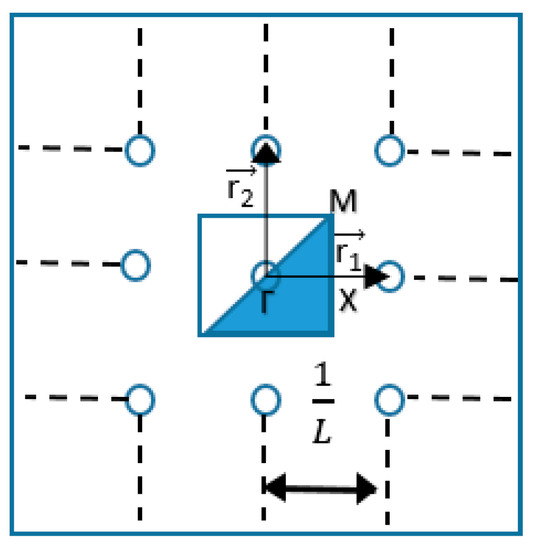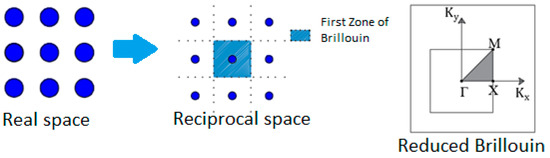 In the reciprocal space, the basis vectors and . The first Brillouin zone is square with as its parameter. The points with high symmetry in this primitive mesh are named Γ, X and M (as shown in Figure 5), and their respective values in the reciprocal array (Γ,, ) are (0,0), (,0) and (,) [2,18].