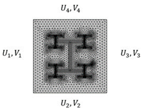 Bloch’s boundary conditions were implanted on the unit cell’s exterior edges (Figure 6). Since our importance was in the propagation of seismic waves in the plane X–Y, we used them to model the periodicity of the cells in the two directions (X, Y). The corresponding equations of Bloch’s conditions are