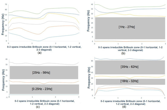 The displacements between points of the array to another space in a mesh can be translated by the phase shift of . To calculate the band-gaps of a periodic array, we limited the study to an elementary cell by applying the periodic boundary conditions given by Equation (3) below: