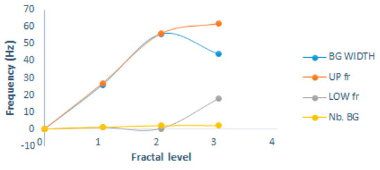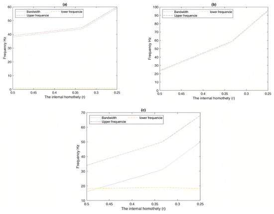 Consequently, we can observe that this increase by up to two times does not affect the propagation in the lowest bands, since the lower band-gap limit is maintained constant, as shown in Figure 9. It is not affected by the change in the internal homothety of a fractal structure.
