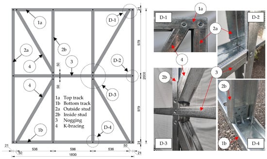 The CFS frame consists of four studs, each 1998 mm long, evenly spaced with an axial distance of 586 mm. These studs are attached to the upper and lower tracks. In addition, the studs are connected in the middle by a nogging with a web notch that allows the passage of the interior studs. The total width and height of the assembled frame are 1800 mm and 2000 mm, respectively. The stability of the frame is achieved by four diagonal braces that form two K-bracing in the outer stud placements. All parts of the CFS frame, including studs, tracks, noggins, and diagonal braces, were manufactured using automated CNC technology of roll forming C-sections with cross-sectional dimensions of 89 mm web × 42 mm flange × 12 mm lip × 1.15 mm thickness in steel grade S550 GD.