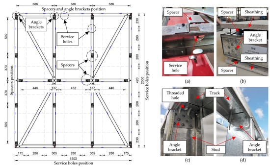 Position of the angle brackets, spacers, and service holes on the CFS frame with details of (a) spacers and service holes on CFS frame, (b) frame with sheathings, and (c,d) details of angle bracket mounted on the frame stud (mm).