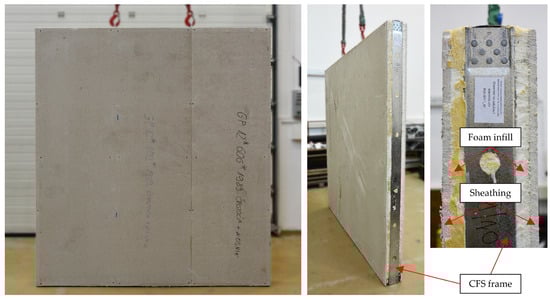 A CFS-PU composite wall panel is filled with closed-cell PU foam with a nominal density of 45 kg/m3, which is injected under pressure between the sheathings and the CFS frame. The PU foam fills the space between the CFS elements of the frame and in the process of expansion achieves an adhesive bond with the CFS structure and sheathings. The results of the adhesive bond test can be found in [,]. Figure 4 shows the CFS-PU composite wall panel with sheathing and PU foam filling.