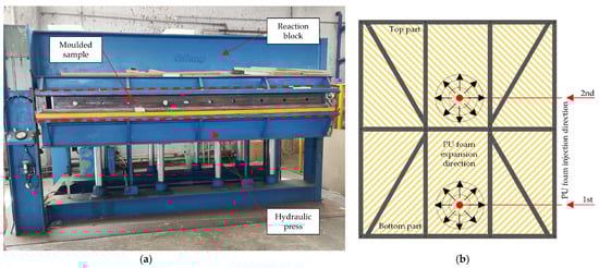 Prior to the injection procedure, the test specimens, which consisted of a CFS frame and sheathing with pre-installed spacers and angle brackets, were properly assembled. After assembly, the test specimen was placed in a mould to prevent PU foam leakage from the edge areas during the injection process. The specimen was then placed under a press to prevent damage or breakage during the PU foam expansion process and to keep the sheathing stable and secure, as displayed in Figure 5a. A low-pressure polyurethane foam machine with a variable pressure capacity of 4 to 10 bar and an output range of 1000 g/s was used for the foam injection. The PU foam injection process was carried out in two phases, with the PU foam being injected in a liquid state alternately from two positions. During injection, the PU foam was injected into the central stud placement between the interior studs, as shown in Figure 5b. This ensured that the PU foam was evenly distributed over the top and bottom part of the panel. After injection, the panel was left in the press for one hour to allow the PU foam to cure. Once the PU foam had cured, the specimen was removed from the press and demoulded.