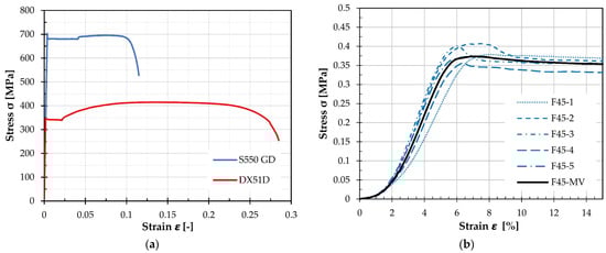 The C-profiles are made of steel grade S550 GD, while the angle brackets are made of steel DX51D-Z275. To determine the mechanical properties of these steels, uniaxial tensile tests were carried out using the Zwick/Roell Z600 universal tensile-compression testing machine. The tests were performed at room temperature according to method A of the Standard EN ISO 6892-1:2019 for metallic materials []. The results of these tests, including the average values of the modulus of elasticity , the upper yield stresses , and the tensile strengths for each steel, can be found in the article []. In addition, Table 2 provides a summary of these average values as well as the strains measured with an external extensometer at a gauge length of 50 mm, including the average values of strain at yield , and total percentage strain at maximum force and at break . Finally, Figure 6a shows the stress–strain curves of the tested materials based on their average values.