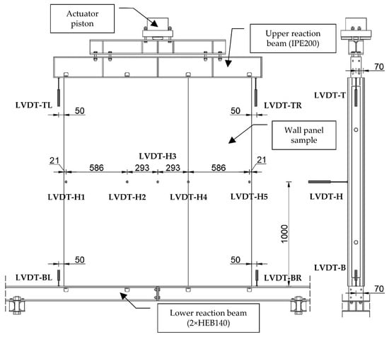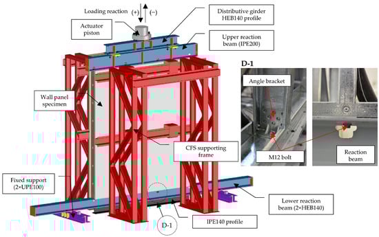 The test setup is shown in Figure 7. It was designed in such a way that the supports and load conditions correspond to the real-life conditions of the wall panel. This was achieved by connecting the frame tracks to both the lower and upper reaction beams with bolts. The lower reaction beam consists of two HEB140 profiles connected together with four M12 bolts through holes in the end plates of the profiles. Two fixed supports made of symmetrically welded UPE100 profiles served to anchor the lower reaction beam to the rigid concrete base with M36 anchor bolts. The connection between the reaction beam and the fixed supports was made with four M12 bolts on each support. To reduce the deflection of the lower reaction beam during the test, an IPE100 profile was placed centrally under the beam. An IPE200 profile was also used to construct the upper reaction beam. To distribute the load evenly across the upper beam, a smaller HEB140 distribution girder was placed on top and connected to the upper beam with four M12 bolts. To ensure that the tested specimen remained securely attached to the apparatus, the specimen was attached to the lower and upper reaction beams using bolts. Four M12 bolts were used per beam to properly secure the specimen. Before attaching the bolts, holes were cut in the webs and flanges of the two reaction beams. This allowed the bolts to be screwed into the angle brackets that had previously been inserted into the CFS frame. The vertical load was applied using a Zwick/Roell actuator with a capacity of 500 kN. The load was applied by displacement control with a test speed of 2.5 mm/min. To ensure the specimen’s out-of-plane stability, a special CFS frame structure was designed and built. This frame structure was anchored in the concrete base and placed on both sides of the specimen. This structure additionally protected the measuring equipment from damage in case of specimen failure.
