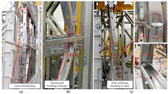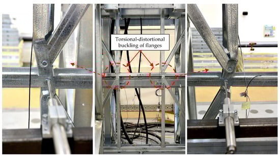 Moreover, it was found that another mode of failure had occurred, as shown in Figure 13c. The failure occurred in the connection zone between the diagonal element and the inner stud. Specifically, deformation buckling of the stud flanges was observed to occur at the point where the lip cuts were made to connect the diagonal to the stud. Assuming that the specimens from CFS-PU behave similarly to the specimens from CFS-F, it can be considered that the buckling of the flanges occurred before the web buckled on the outer stud.