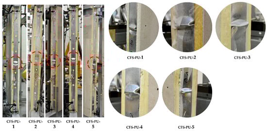 Similar to the CFS frame specimens, no significant local buckling was visually observed in the CFS-PU composite wall specimens during the loading. However, due to the infill and sheathings, it was not possible to observe the behaviour of the CFS frame within the wall panel during the test. At an average load value of 307.6 kN, an asymmetric increase in displacement was observed on one side of the test specimen, followed by the occurrence of local web buckling on the outer stud in the middle span. Following this observation, the force value dropped by an average of 6.57%. Despite the drop in force, the specimen did not lose its full load capacity and with a further increase in load, an increase in the load capacity was observed. However, there was another sudden drop in force followed by increasing deformation of the buckled web. The test was stopped when the force dropped by 35%. Similar failure modes occurred in all CFS-PU specimens, although the outer studs varied. The position of the failure was always on the middle length of the stud. Figure 11 shows the failure modes of all of the CFS-PU specimens.