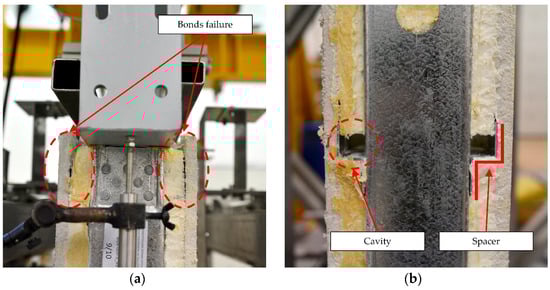 Failure modes of CFS-PU specimens with details of (a) bond failure between foam and sheathings and (b) cavity forming in the spacers area.