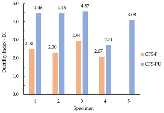 To evaluate the ductility properties of the CFS-F and CFS-PU specimens, the ductility index (DI) was used. The DI was determined using Equation (2), which expresses the ratio between the areas under the axial load–displement curves at specific points.