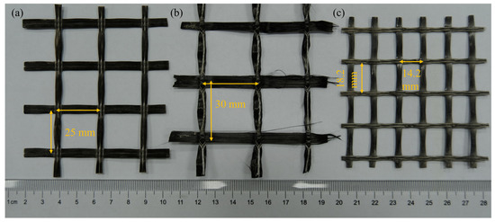 Three distinct fibers—carbon, basalt, and E-glass—were set up and used in an experimental campaign to measure the residual tensile strength of textile yarns and composite coupons after exposure to high temperatures. The coupons were made of grid-shaped fibers in a commercial polymer-modified cementitious mortar containing a trace amount of microfibers (the supplier provided no further information). Four target temperatures—20 °C, 100 °C, 200 °C, and 300 °C—were chosen, with specimens tested at room temperature (20 °C) serving as the reference. The mortar preparation’s water-to-binder mass ratio was 0.18. All fabrics were bidirectionally woven with the grid dimensions depicted in Figure 1. The warp and weft yarns were stitched together in the basalt and carbon grids, whereas the glass grid was thermofixed; the basalt yarns comprised two separated bundles. A high-temperature resistive agent was utilized as the carbon and basalt fiber coating material (the provider provided no details). At the same time, styrene–butadiene rubber (SBR) was used for the glass counterparts. The distribution of the glass fibers was 52% for the warp and 48% for the weft, but the reinforcement in two orthogonal directions was the same for the basalt and carbon textiles. The nominal roving area of textiles was estimated according to the area weight, coating substance content, and corresponding fiber density (Table 1).