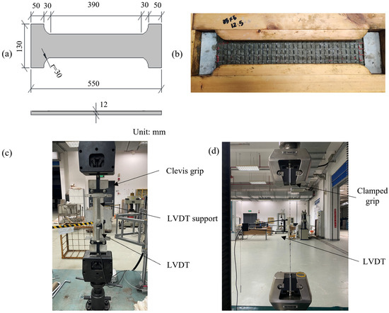 According to EN 1015-11: 2019 [28], the mechanical characteristics of the mortar were evaluated by prism samples utilizing metallic molds with dimensions of 160 × 40 × 40 mm. For each temperature (the ambient included), three samples were cast and allowed to cure for 28 days in a controlled environment at 20 °C and 95% relative humidity. The dumbbell-shaped composite specimens (coupons) utilized for the tensile testing had a total length of 550 mm and a rectangular gauge area of 390 × 70 mm in the center; the dimensions used were according to De Santis et al. [29] (Figure 2a). The shape of the specimens and the test set-up adopted in this experimental campaign had certain variations compared with guidelines (e.g., AC 434 report [30]). The dumbbell shape was chosen against the rectangular one to accommodate the customized grip presented in the following section. The specimens consisted of a fabric textile laid manually in the middle of two mortar layers having 6 mm thickness each. The ends of the grids were adhered between two aluminum plates by a high-temperature resistive adhesive in an alternate arrangement described in Molter [31], preventing the heads of the dumbbell-shaped coupons from prematurely failing. The TRM specimens were prepared using specially made timber molds (Figure 2b). These specimens had an average thickness of 12 mm. All samples were kept in the laboratory (under indoor, protected conditions) for seven days until the start of the testing. Additionally, at least four separate yarns were extracted from each grid type and put through similar tests to monitor the fibers’ residual properties. The total length of the yarn samples was 300 mm, leaving an effective gauge length of 200 mm.