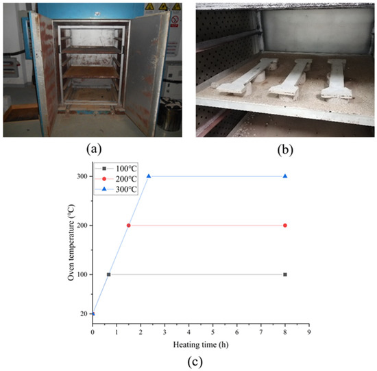 Colombo et al. conducted one of the earliest experiments to examine the residual tensile strength of AR-glass fiber TRMs following exposure to high temperatures [13]. The specimens were reinforced with two layers of grids before being put through tensile testing after spending two hours in temperatures as high as 600 °C. Similar tests were carried out by Rambo et al. [14] and Rambo et al. [15]. They employed coated basalt fiber grids inserted in refractory concrete made of high alumina cement and calcium–aluminate aggregates. The samples underwent tension testing after exposure to temperatures between 75 °C and 1000 °C. Specifically, at 200 °C, three exposure periods were employed—1 h, 3 h, and 6 h. The effect of the coating on the postheated tensile behavior of carbon FRCM specimens was examined by Donnini et al. [16]. Three groups of specimens reinforced with three types of carbon fabrics (dry, epoxy-coated, and sand-treated) were heated at 120 °C for 60 min and 100 min. The residual strength of textile-reinforced concrete (TRC) exposed for one hour at five target temperatures—75 °C, 150 °C, 300 °C, 400 °C, and 600 °C—was measured by Tlaiji et al. [17]. The specimens were reinforced with AR-glass fiber textiles. Messori et al. [18] investigated the postheated tensile strength of specimens reinforced with epoxy-coated AR-glass grids exposed to 100 °C, 150 °C, 200 °C, and 250 °C for two hours. Truong et al. [19] studied the performance of the lap-splice length and its influence on the residual strength of TRM coupons reinforced with carbon fiber textiles embedded in alumina cement-based mortar. The specimens were subjected to uniaxial tensile tests after exposure to 250 °C and 300 °C. Kapsalis et al. [11] presented results from an extended experimental campaign comprising a wide range of carbon and glass fiber grids—coated or dry—in low- and high-volume fractions embedded in a commercial cementitious matrix reinforced with micropolypropylene fibers. Τhe specimens were fired up to 700 °C using a specially designed furnace. Estevan et al. [20] investigated the tensile behavior of postheated TRM specimens embedded with basalt, carbon, and two types of AR-glass textile grids. The temperature path contained a one-hour maintenance at target elevated temperatures up to 600 °C. Ombres et al. [21] added to the knowledge on the residual characteristics of PBO grids embedded in cement-based mortars following exposure to hot conditions. The authors conducted a series of tensile tests on TRM coupons following five heating cycles at 100 °C and 200 °C as part of an experimental program examining the residual properties of PBO-confined concrete cylinders. Additional details on specimens reinforced with PBO grids subjected to 100 °C while under tensile stresses were published by Calabrese et al. [22]. Five coupons were put through six hours of dry-heat conditioning and tension testing.