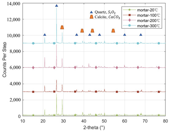 XRD analysis on mortar samples preheated to different target temperatures.