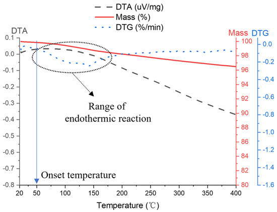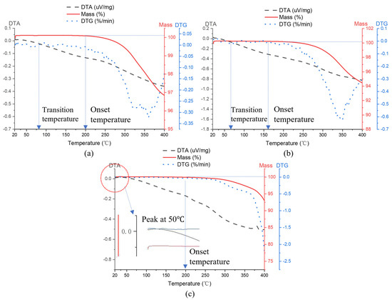 The TGA results supported the findings described above (Figure 13). The onset temperature for all fibers ranged between 150 °C and 200 °C. The extrapolated onset temperature () for the carbon and basalt fibers was around 270 °C and 360 °C for the glass counterparts, marking the initiation of mass loss related to the volatile behavior of the coating agent. The inflation point for the carbon and basalt fibers was around 360 °C and 400 °C for glass. Additionally, in the differential thermal analysis (DTA) curve for the carbon and the basalt fibers, a slight change occurred at around 70 °C, while a peak occurred close to 50 °C for the glass fibers, signaling the glass transition temperature for the coating agents. Additional information for defining the terms mentioned above is presented in Appendix A.