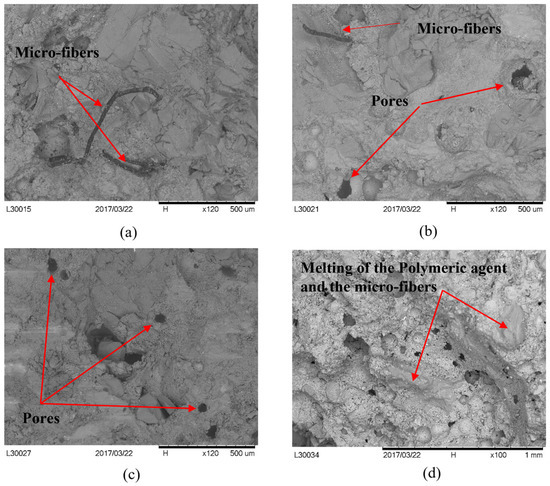 The changes that were observed in the mortar’s microstructure are presented in the following section. The results obtained from the XRD analysis are presented in Table 3 and Figure 4. As can be seen, between 20 °C and 100 °C, there was a decrease in the integrated peak intensity (IPI) of calcium hydroxide owing to improved ‘curing’ conditions allowing the polymeric film dispersion. The resiliency of the flexural strength was thought to be caused by this phenomenon, combined with the existing microfibers and the drop in water content from evaporation [5]. Additionally, the IPI of quartz and calcite was relatively high at room temperature. The first indicated that carbonation began during the test, whereas the second correlated to the increase in the elevated silica level of the polymeric component [32]. The delayed ettringite formation (DEF), which occurs between 20 °C and 100 °C, was probably the reason for the increase in the relevant IPI—that extra amount aided in the mortar’s continued degradation [37]. Above 100 °C, the ettringite becomes unstable and starts to decompose. As Table 3 shows, between 100 °C and 200 °C, the polymeric film’s deterioration allowed the release of calcium hydroxide; between 200 °C and 300 °C, the decrease in the latter might be attributed to supplemental carbonization, hence the increase in calcite. Zhou and Glasser [38] and Jeong et al. [39], reported that if the specimens return to environmental conditions after heating, then the C-S-H, the monosulfate and the pore solution can react and produce more ettringite. Therefore, this most likely explains why the IPI for the specimens treated at 300 °C was enhanced; however, a more in-depth investigation of the phenomena is outside the boundaries of this work. Additionally, the TGA test results show that the first stage of mass loss began at 80 °C due to the evaporation of unbounded water, with a starting temperature of 50 °C (the endothermic reaction’s peak is shown in Figure 5). Extra information on the use of the TGA is provided in Appendix A. The decrease in the compressive strength between 20 °C and 100 °C is linked to the procedure above; the water evaporation helps the microcrack formation and weakens the cohesive forces within C-S-H [40]. Above 100 °C, the dehydration of C-S-H and the ettringite decomposition partially restored the compressive strength [38,41,42]. The latter is decomposed at around 120 °C, hence the observed peak of the derivative mass loss (DTG) (Figure 5). Additionally, the SEM pictures demonstrate a gradual deterioration of the mortar’s internal structure. They depict the melting of the microfibers in temperatures above 200 °C, which increased the porosity and further weakened the mortar’s performance (Figure 6).