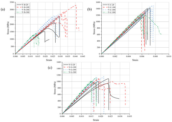Stress–strain relationship of (a) basalt, (b) carbon, and (c) glass fiber yarns.