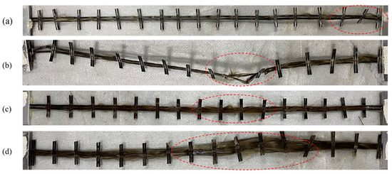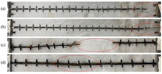Failure modes of basalt fabric yarns at (a) 20 °C, (b) 100 °C, (c) 200 °C, and (d) 300 °C.