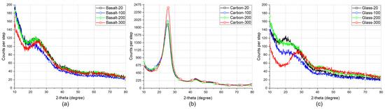 Figure 11a–c presents the XRD curves for the three types of fibers subjected to different temperature environments. Changes in the peak intensity demonstrated a dependency on the types of fibers and temperature. As was expected, the basalt and glass fibers had similar curves, whereas the respective carbon exhibited a different XRD pattern. The changes were more evident for the basalt and glass than for carbon fibers throughout the range of temperatures, implying changes in the microstructure. Additionally, their samples heated to 300 °C showed a sizable peak intensity shift to the right. Particularly for the glass fibers, this pattern was more noticeable (Figure 11c). Those changes were attributed to the weakening of the chemical bonds in the basalt structure [44] and the lattice’s compressive stresses caused by the glass fibers’ contraction [45,46]. At the same time, the carbon fibers exhibited a considerable change in the XRD curve between 200 °C and 300 °C (the corresponding peak became broader than in the previous temperatures). The slight alteration in the grain sizes caused by the degree of graphitization of carbon was responsible for that change after exposure to 300 °C.