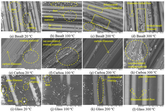 SEM analysis for (a–d) basalt, (e–h) carbon, and (i–l) glass fibers preheated to different target temperatures.