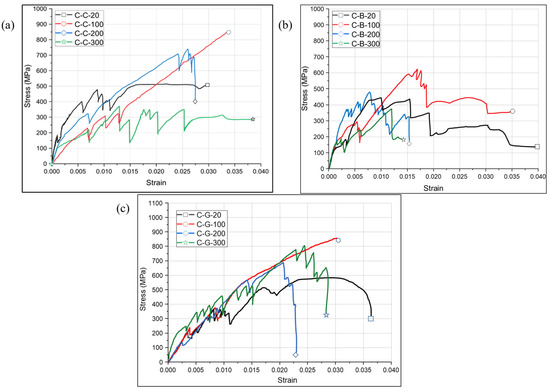Table 4 summarizes the heat-treated basalt, carbon, and glass textile yarn’s residual tensile strength. The maximum load measured over the roving area was the basis for calculating the tensile strength, while ASTM D2256-02 [43] was used to determine the elastic modulus. The relevant strain was determined based on the deformation obtained from the two LVDTs divided by the gauge length. The relative stress–strain curves are shown in Figure 7. The outcomes demonstrated that the three different fibers’ residual strengths were affected by temperature in various ways. Starting from the basalt yarns, the exposure to 100 °C increased the tensile strength by 37%, while at 200 °C, there was an increase of 31%. The residual strength at 300 °C deteriorated fast, exhibiting a drop of 33%.