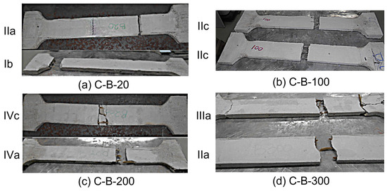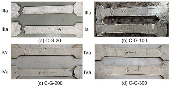 At 20 °C, the glass counterparts failed, exhibiting both IIIa and IIIb modes, whereas the specimens exposed to 100 °C failed due to Ia and IIIa types (Figure 17a,b). Instead, the 200 °C and 300 °C developed multiple cracks—both failed due to rupture of the glass filaments (Figure 17c,d). The grid behaved at the last stage precisely like the appropriate fabric braids during the tensile testing.