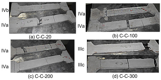 Up to 200 °C, the carbon fiber-reinforced coupons failed, exhibiting multiple cracks perpendicular to the axis of the specimen; the cracks followed the grid’s dimensions along the weft yarns. Fiber rupture characterized the failure of one coupon at 20 °C, whereas the others failed due to slippage or a combination of slippage and tensile failure. The failure mode was type IVa up to 200 °C, but at 300 °C, the loss of the coating material and the stitch bonding altered the failure mode to type IIIc (Figure 16d).