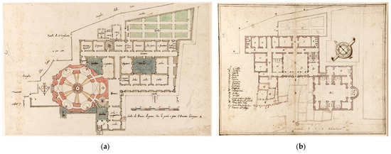 Architectural drawings of the Jesuit college by (a) Serafino Fabrini in 1659; (b) Henri Lalojau in 1699, from the National Library in Paris [23].