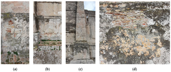 The non-uniform material composition of the external walls and columns: (a) wall with irregularly integrated bricks and stones; (b) wall with integrated layers of brick and stone on top of each other; (c) column brickwork; (d) exposed external wall portion made of bricks (illustration source: Davorin Penava).