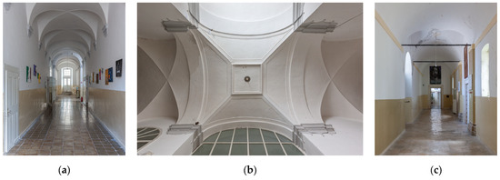 The building has a footprint of 57 m × 32 m with a total area of approximately 1690 m2. The ground, first, second, and third stories have an approximate inter-story height of 2.92 m, 5.30 m, 4.0 m, and 3.35 m, respectively. The wall height reaches up to a maximum of 22 m with the thickness varying within a range from approximately 70 cm to 105 cm. The roof structure is predominantly made of wood with no precise information available regarding the material properties. The wooden floors are covered with a light concrete cover of approximately 7 cm and are braced by wooden beams (depth range of 12 cm to 26 cm) either supported over the corbels or embedded into the adjacent walls. The cross-ribbed, cloister, and barrel vaults made of stone masonry support the floor system and represent one of the most important structural and architectural features of the building (see Figure 4). The complex geometry of the vaults is formed by multiple arch assemblies enchained together into a continuous surface. The iron tie-rods provide auxiliary support to the vaulted structure and walls against out-of-plane deformations. The presence, location, and position of tie rods indicate intervention activities (i.e., retrofitting, strengthening, etc.) throughout the building’s history [27].