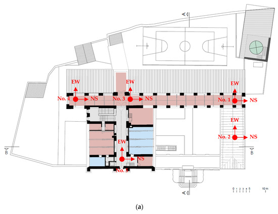 In addition to an overview of the sensor layout, Figure 5c–e provides an insight into the structural (stone) masonry wall disposition and irregularity of the building construction. The positions for the measurements were selected across the building to possibly verify the interconnectivity between different wings of the building (structural wholeness). The calculated coefficient of variation is approximately 34% for the 2nd story and 12.5% for the 3rd story (EW and NS) (see Table 1). The overall variation coefficient is approximately 30% for the EW direction and approximately 20% for the NS direction, which indicates irregular behavior of different parts of the building, variation in material properties, structural weaknesses, and material degradation. The natural periods of the building, based on the overall average frequencies, are 0.16 s in EW, and 0.13 s in NS, i.e., longer direction, respectively.