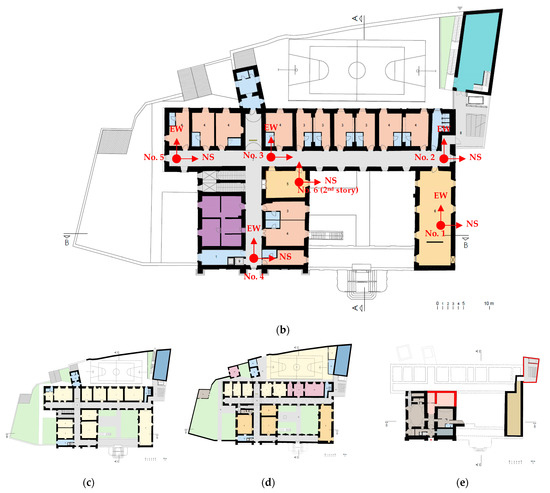 Building plan with an overview of the sensor layout and direction (red): (a) 3rd story (attic); (b) 2nd story; (c) 1st story; (d) ground story; (e) basement.