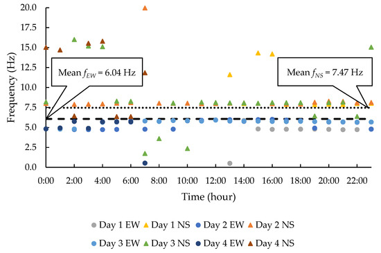 Figure 6 shows the variation in the natural frequencies of the building based on continuous measurements with overall mean frequencies as reference values. The occasional discrepancies occurred due to external factors and were not considered in the analysis of vibrational characteristics (4 Hz < f < 10 Hz).