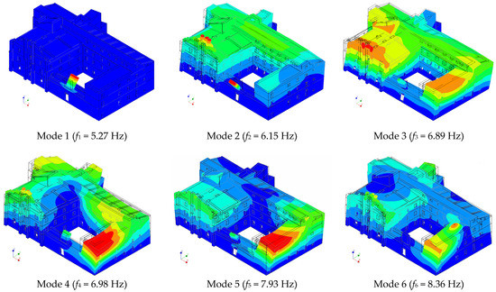 The cumulative effective mass for the first six free vibration modes corresponds to approximately 70% in the NS and 72% in the EW directions. The accumulation of higher mass participation requires the calculation of a large number of modes, i.e., approximately 250 modes are required to accumulate 90% mass participation in both horizontal directions. The mode shape 1 (f1 = 5.17 Hz) represents a local vibration mode of the clock tower, indicating high expected deformations at a relatively low frequency. Mode shape 2 (f2 = 6.05 Hz) shows the global mode shape in the EW direction with 61% cumulative mass participation. Mode shape 3 (f3 = 6.78 Hz) represents the global mode shape in the NS direction with an effective mass participation of 56%. It is important to note that neither of the global mode shapes represents pure translation in either horizontal direction, accompanied by a significant translational motion in the orthogonal direction (see Figure 8). In the case of mode shapes 4–6, the concentrated deformations in various parts of the structure show potentially vulnerable zones even though these modes do not contribute significantly to the global dynamic response due to their relatively low mass participation.