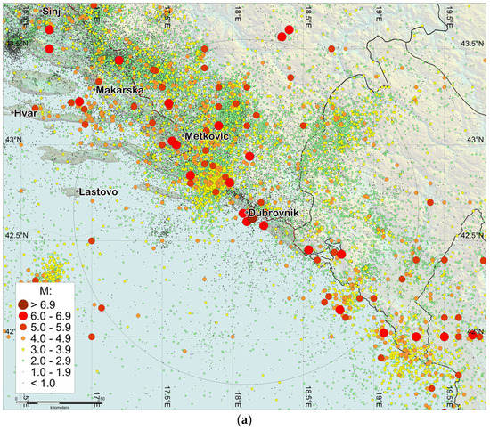 (a) Spatial distribution of earthquake locations around the Dubrovnik area based on data from the Croatian Earthquake Catalogue (updated and continuously supplemented version first described in [43] for the period BC–2021. Circle marks the area inside 100 km from Dubrovnik); (b) seismic micro-zoning in compliance with MCS scale available at [46].