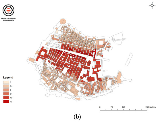 To mitigate the effect of earthquakes, retrofitting programs were initiated in the 1980s to repair and strengthen the heritage buildings in Dubrovnik (see Figure 10b). The last significant earthquake in the region occurred in 1996 near Ston VIII–IX (°MCS), and in Dubrovnik it manifested itself with an intensity of V–VI (°MCS) [47], causing minor damage to buildings in the Old City. The region remains an area of high earthquake risk (see Figure 11), emphasizing the importance of a continuous effort toward strengthening cultural heritage assets.