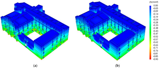 Vertical stresses due to the gravity load combinations applied following the code requirements: (a) Load combination LC1; (b) Load combination LC2.