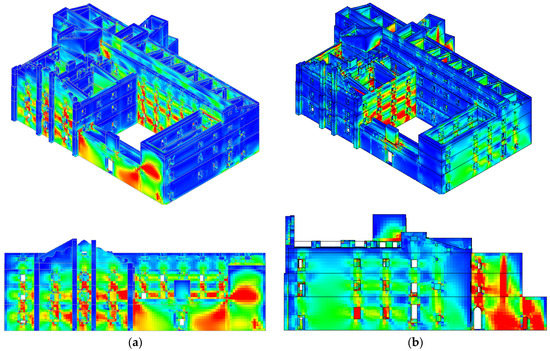 The numerical results indicate numerous wall segments in the building that experience stresses higher than the elastic tensile limit of 0.30 MPa. Critical zones with high tensile stresses due to the out-of-plane bending of the walls are identified to provide recommendations for strengthening and retrofitting. These include the facade walls of the west wing, the north façade of the south wing where there is an intersection with the east and west wings, the base of the clock tower, the piers between adjacent wall openings, the walls of the hallway in the south wing, the south-wing facade, and the west-wing façade. Out-of-plane bending is observed at the west- and south-wing walls. The out-of-plane bending is primarily attributed to the absence of moment stabilizing elements, flexible diaphragms, and the minimal torsional effects caused by inherent eccentricity. The wall sections between adjacent openings are prone to shear stress concentration due to the relatively small slenderness ratios (see Figure 15, indicated by red colors).