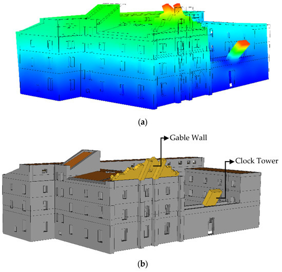 Out-of-plane failure mechanism: (a) Identification of vulnerable areas using modal analysis; (b) Kinematic block of the gable wall and clock tower.