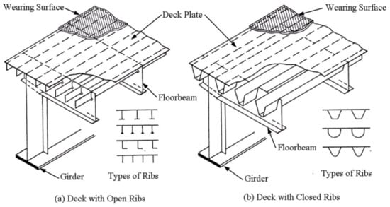 The OSD, consisting of the deck plate, respectively, stiffened by the floorbeam and the ribs in bridge transverse and longitudinal directions, presents different structural properties in two orthogonal directions. The OSD was first used in Germany as the bridge deck to build the steel bridge. After the Second World War, the growing demand for post-war traffic recovery made OSDs widely used in bridge engineering []. Since the Severn Bridge in the UK adopted the OSD steel box girder for the first time, the OSD has become the most popular deck system for long-span bridges. Figure 1 shows two structural forms consisting of open ribs or closed ribs, with the traditional pavement on the deck plate.