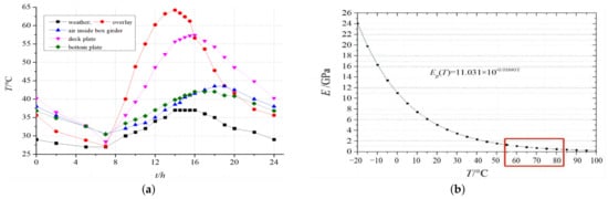 Measured temperature of deck overlay and its elastic modulus of EAC against temperature: (a) Measured temperature of steel girder and its overlay; (b) Elastic modulus of EAC against temperature.