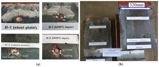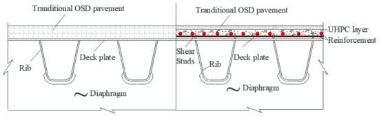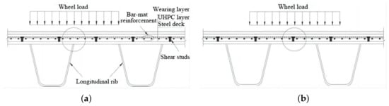 For bridge engineering applications, the fundamental function of the bridge deck is to directly bear, distribute, and transfer the wheel loads. The bridge deck may also react as part of the main girder to bear force acting on the bridge superstructure. Highway bridges normally adopt three types of bridge decks, namely the concrete deck, steel deck, and steel–concrete composite deck []. It is well known that under the action of wheel loads, the concrete decks produce small deformation due to the high stiffness of the deck system. However, its heavy dead load and low tensile strength of concrete limit its application in bridge engineering. The steel bridge deck is usually made of an orthotropic steel deck (OSD), which has light weight, high bearing capacity, and significant overloading capacity. However, this type of deck system can produce large deformation under wheel load due to its low structural stiffness. As a result, fatigue cracking and pavement damage are frequently reported after years of operation. The steel–concrete composite deck includes several types of structures, such as the orthotropic steel–concrete composite deck, the orthotropic steel–steel fiber reinforced concrete composite deck, and the orthotropic steel ultra-high performance concrete (steel–UHPC) composite deck. The first two can only be applicable to medium and small-span bridges because of the large thickness overlay and its significantly increased dead loads. They may also be prone to cracks under concentrated wheel loading due to the low tensile strength of concrete. With the development of the UHPC, the orthotropic steel–UHPC composite deck is widely used in various types of bridge structures with different span lengths, especially in long-span bridges.