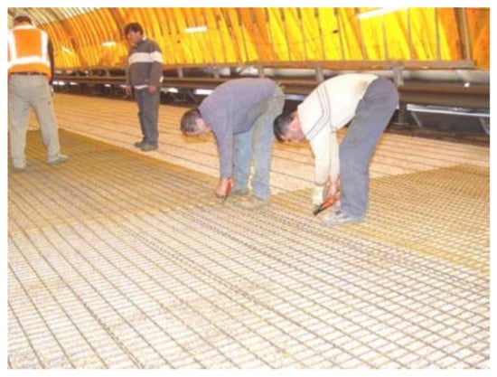 The orthotropic steel–UHPC composite deck consists of the shear connectors welded on the OSD deck plate, and the casted UHPC layer, as shown in Figure 5. In order to reduce the dead loads, the thickness of the UHPC layer is generally 35 mm to 60 mm. While in order to reduce the tensile stress in the thin UHPC layer, double-layer bidirectional (longitudinal and transverse) steel bars are arranged in the UHPC. Steam curing is usually used to reduce shrinkage in the process of curing. In addition, in order to improve the driving conditions on the bridge deck, the traditional 20–40 mm asphalt overlay will be paved on the UHPC. Figure 6 is the major construction process of orthotropic steel–UHPC composite deck.