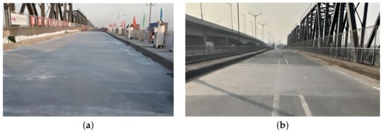 The application of UHPC in bridge engineering in Asia was relatively late, but it developed rapidly over the past decade. Currently, more than one hundred UHPC bridges have been built in Asia, some of which are steel–UHPC composite structures. In China, Shao Xudong [] first practiced the deck replacement of the Zhaoqing Mafang Bridge, by using the UHPC layer, as shown in Figure 8. The thickness of the cast-in-place UHPC layer was 50 mm and the thickness of the surface asphalt pavement was 30 mm. The UHPC layer and the steel panel are connected by way of “stud + epoxy resin adhesive”. Compared with the traditional epoxy pavement on other spans of the bridge, over 12 years of operation demonstrated that the composite deck system has obvious advantages.