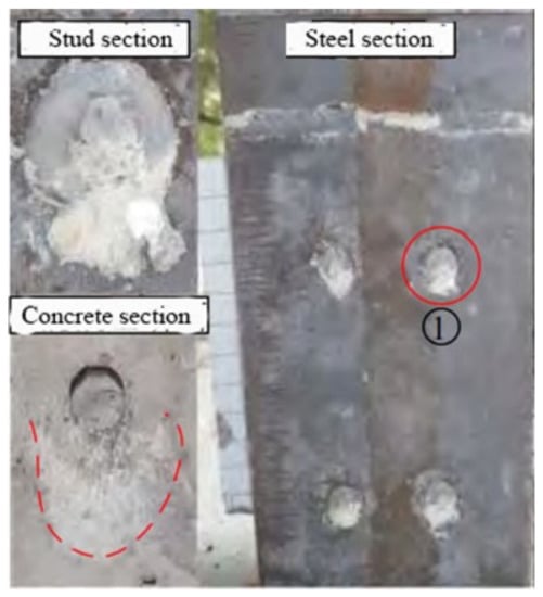 In order to reduce the amount of UHPC, it is necessary to use a thin UHPC layer, so short studs can only be used. Shao [] studied the shear resistance of short studs in the composite deck system, and pointed out that the bearing capacity of short studs was linearly proportional to the second power of stud diameter, while the stud length showed minor effects on the bearing capacity. Wang [] carried out an experimental study on the bearing capacity of large studs embedded in UHPC. The results showed that increasing the diameter of the stud could significantly improve its shear strength, shear stiffness, and ductility, but the aspect ratio of the stud and the thickness of the UHPC layer had no significant effects. Based on model tests and FEM analysis, Li [] analyzed the shear resistance of short studs in UHPC. The results indicated that the shear capacity of short studs was mainly affected by their diameter and weld shape, and shear capacity increased with the increase in stud diameter. While loading mode, stud height, and UHPC strength showed little influence. The shear stiffness was mainly affected by the stud diameter and treatment on the interface between the steel deck plate and the UHPC layer, and good interface bonding helped improve the shear stiffness. Wu [] compared the mechanical properties and failure mode of studs in UHPC and normal concrete, and pointed out that the main failure mode of the stud was shear fracture near the root of the stud, as shown in Figure 11. The shear stress reached a peak at the root and decreased rapidly along the direction of the stud cap. Compared with the traditional concrete specimen, the shear capacity and shear stiffness of the UHPC specimen were higher, but the ductility was lower. Huang [] pointed out that the sliding stiffness of steel–UHPC specimens is increased by about 32.5% compared to steel-normal concrete specimens. Deng [] analyzed the stud shear strength in the steel–UHPC composite deck by FEM. The results showed that the transverse shear strength was twice as high as the longitudinal one. In addition, the vehicle wheel load had a great influence on the transverse shear strength, and the maximum transverse shear stress under biaxial load is about 1.33 times that of the uniaxial load. Guo [] designed and manufactured a large-scale steel UHPC composite bridge deck with welded bolts, and conducted experimental research. The test results indicate that the structural failure mode of the test model is instability and cracking of the middle diaphragm, while there is no relative sliding displacement at the steel–UHPC connection interface.